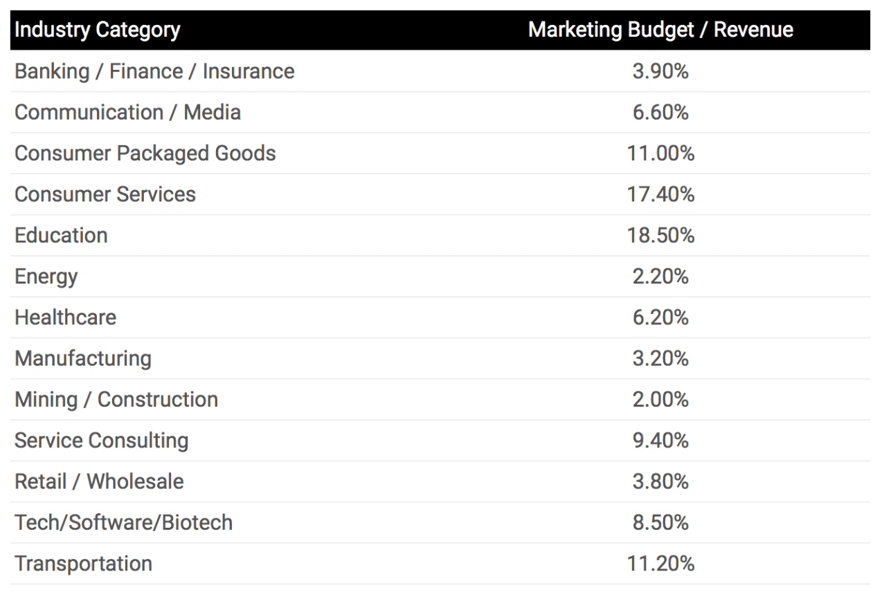The following tables show the average percentage of marketing budgets broken down by industry category and revenue size: