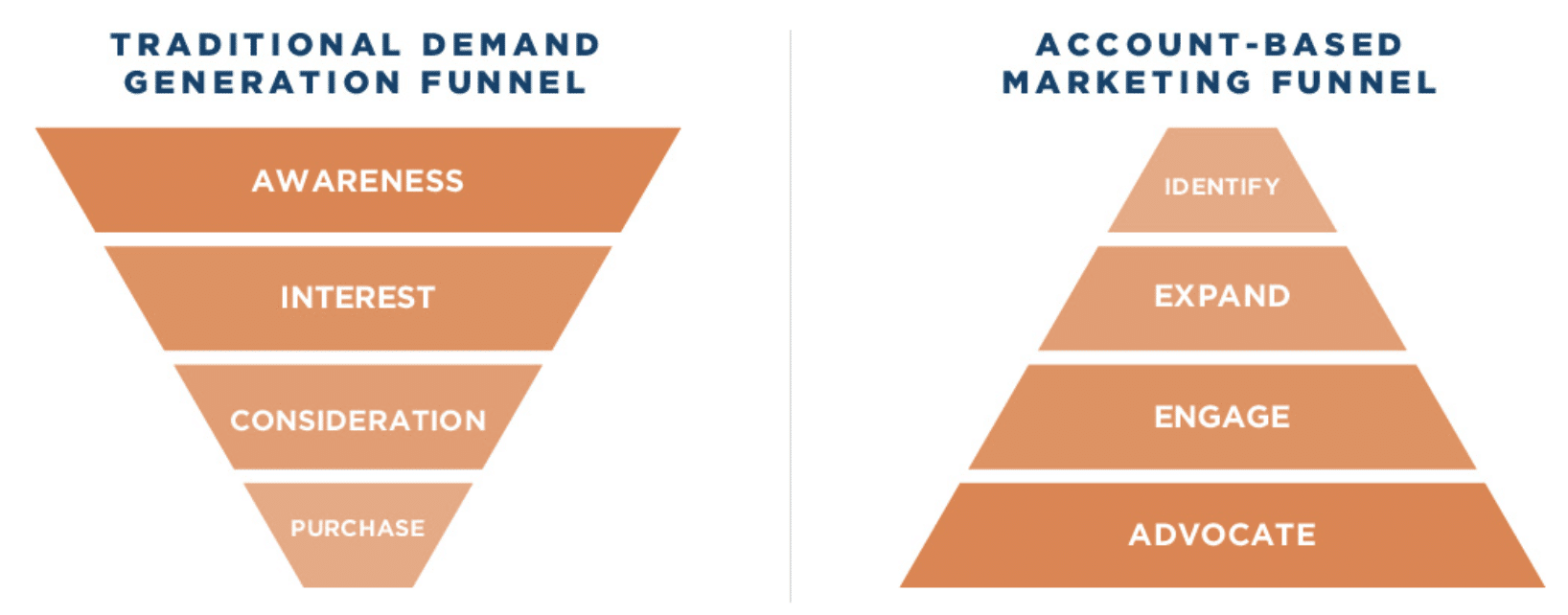 HubSpot defines inbound marketing as “a business methodology that attracts customers by creating valuable content and experiences tailored to them”. One major difference between ABM and inbound marketing is that they have opposite sales funnels. ABM is started with looking for target accounts and then followed by creating personalized content to build lasting relationships with customers. While inbound marketing is started off by creating relevant content to attract leads, engage and convert them. ABM focuses on a select group of accounts. On the other hand inbound marketing casts a wide net to attract potential customers.