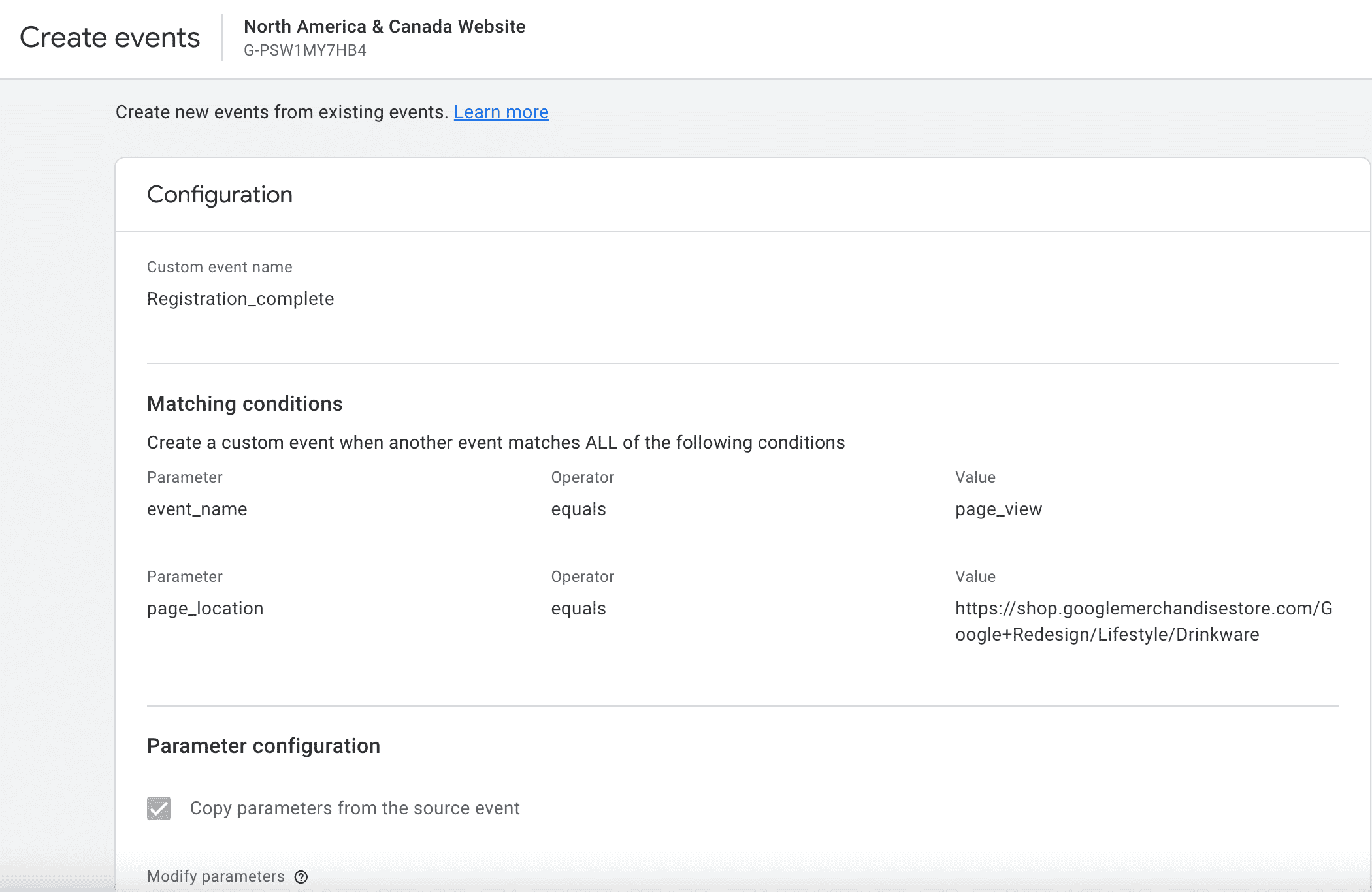 Next, choose parameters configuration. If you want the parameters from the original event then choose “Copy parameters from source event”. Otherwise, you can create additional parameters for the new event you create.